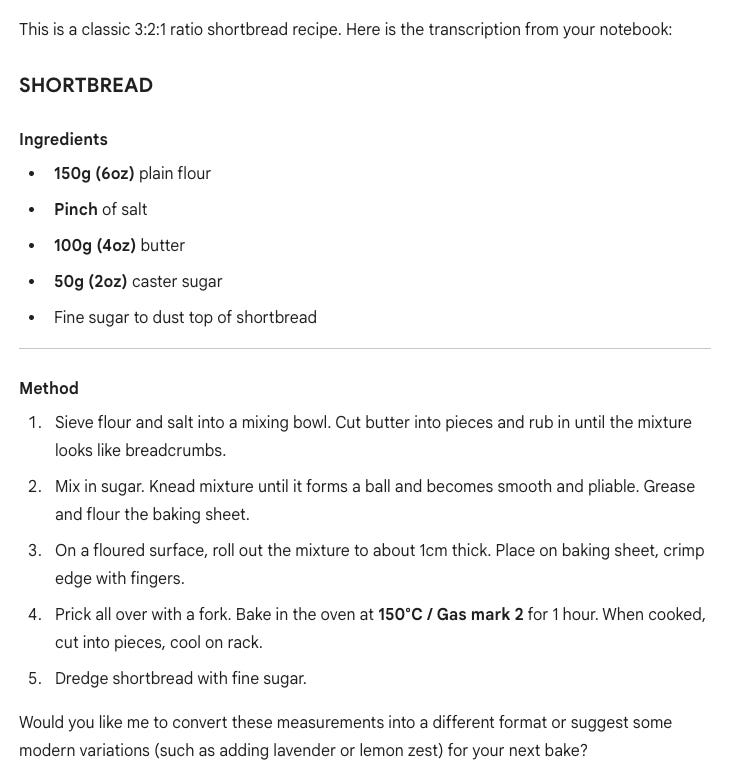 After identifying it as a “classic 3:2:1 ratio shortbread recipe”, it provided a perfect transcription of the recipe, before offering to suggest some modern variations.