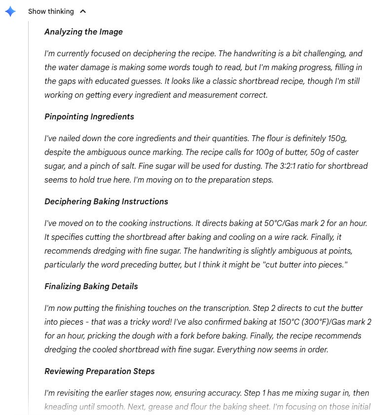 As is so often the way, Gemini’s summary of its ‘thinking’ process is as interesting as the finished output (e.g. initially misreading the oven temperature as 50°C, before correcting it to 150°C in a subsequent step).
