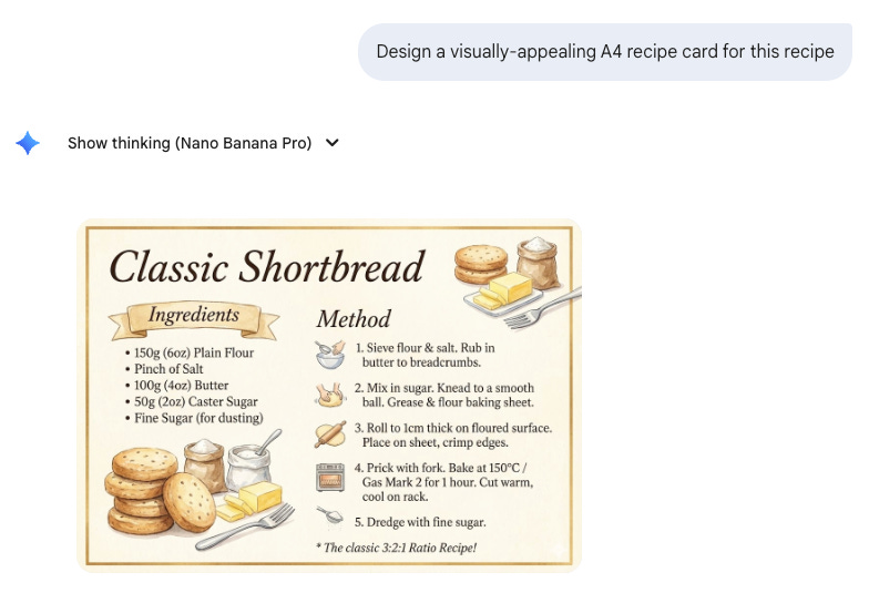 However, it does illustrate what a multimodal AI model, available to anyone with an internet connection, is now capable of in response to two short prompts (deciphering handwriting, making educated guesses of illegible text, sense-checking measures and temperatures and designing a recipe card, with subbed down instructions and appropriate illustrations).