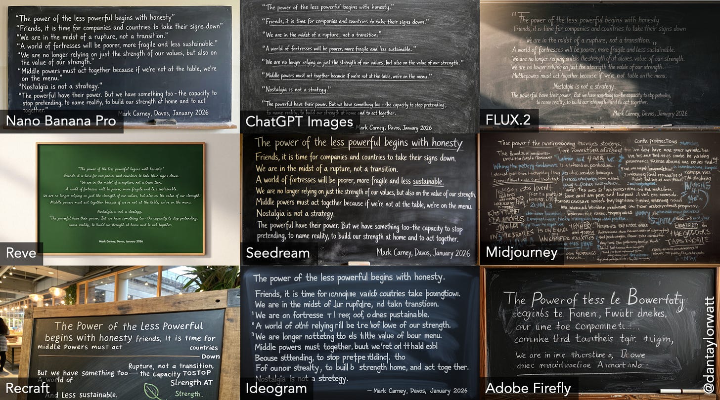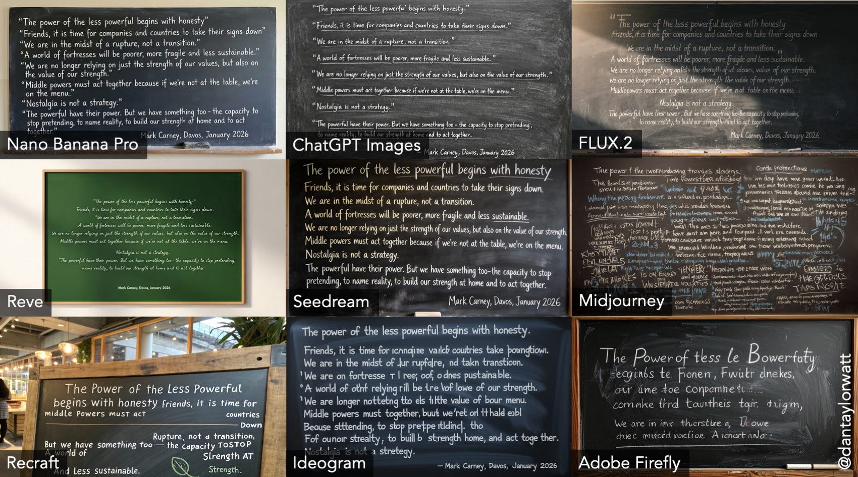 FLUX.2, Reve and Seedream all accurately recreated the text but only Nano Banana Pro and ChatGPT Images rendered all but one of the quotation marks. ChatGPT Images just takes it for having the more plausible handwriting.
