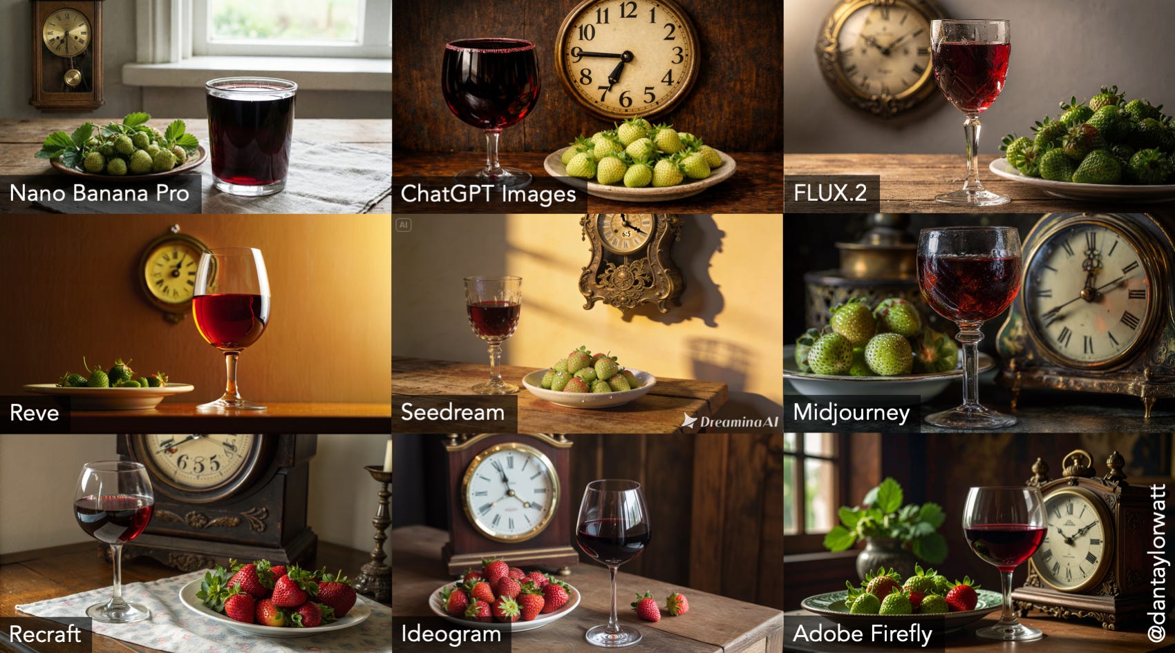 This prompt was designed to test the models’ ability to counter strong visual biases in their training data (wine glasses are rarely pictured full to the brim, strawberries are normally photographed when ripe and clocks typically show ten past ten in commercial photography).
