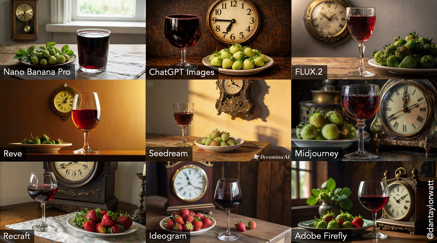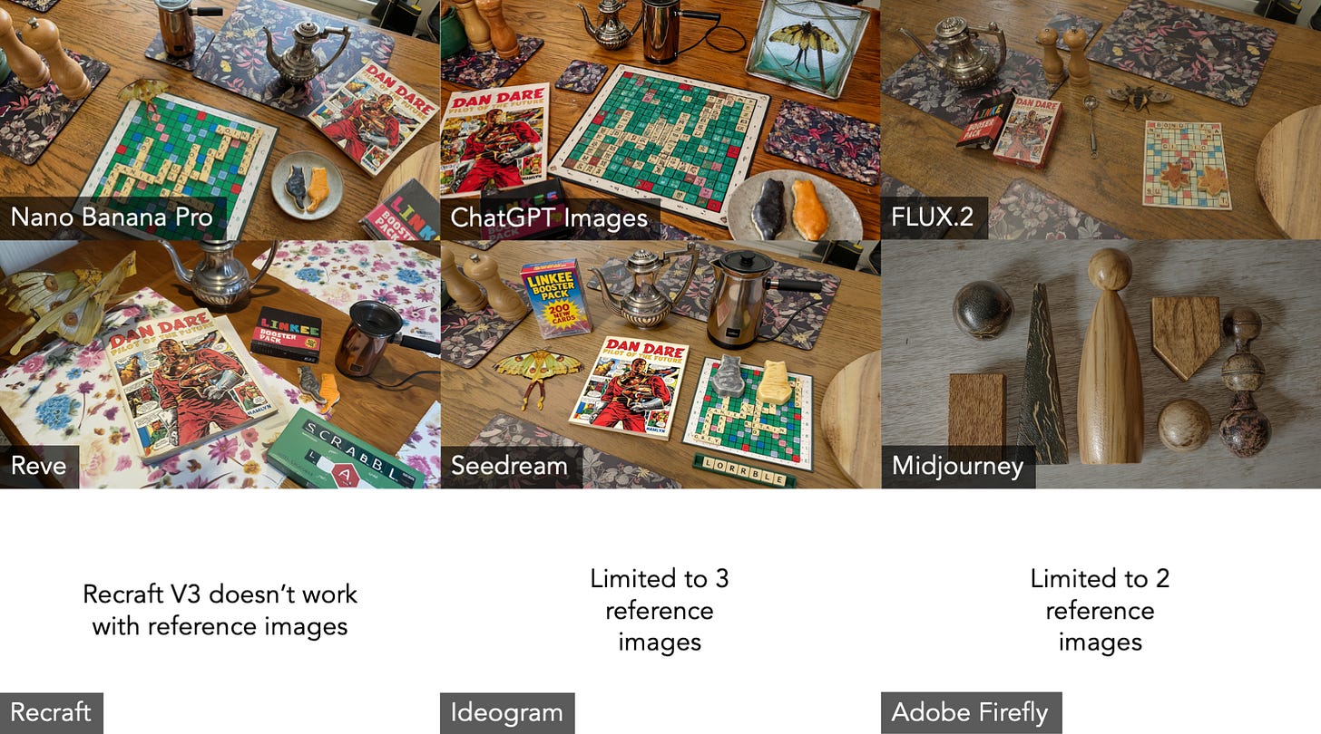 Reve decided to box up the Scrabble, whilst Seedream rebranded Linkee and FLUX.2 swapped the hot chocolate maker for a silver spoon.