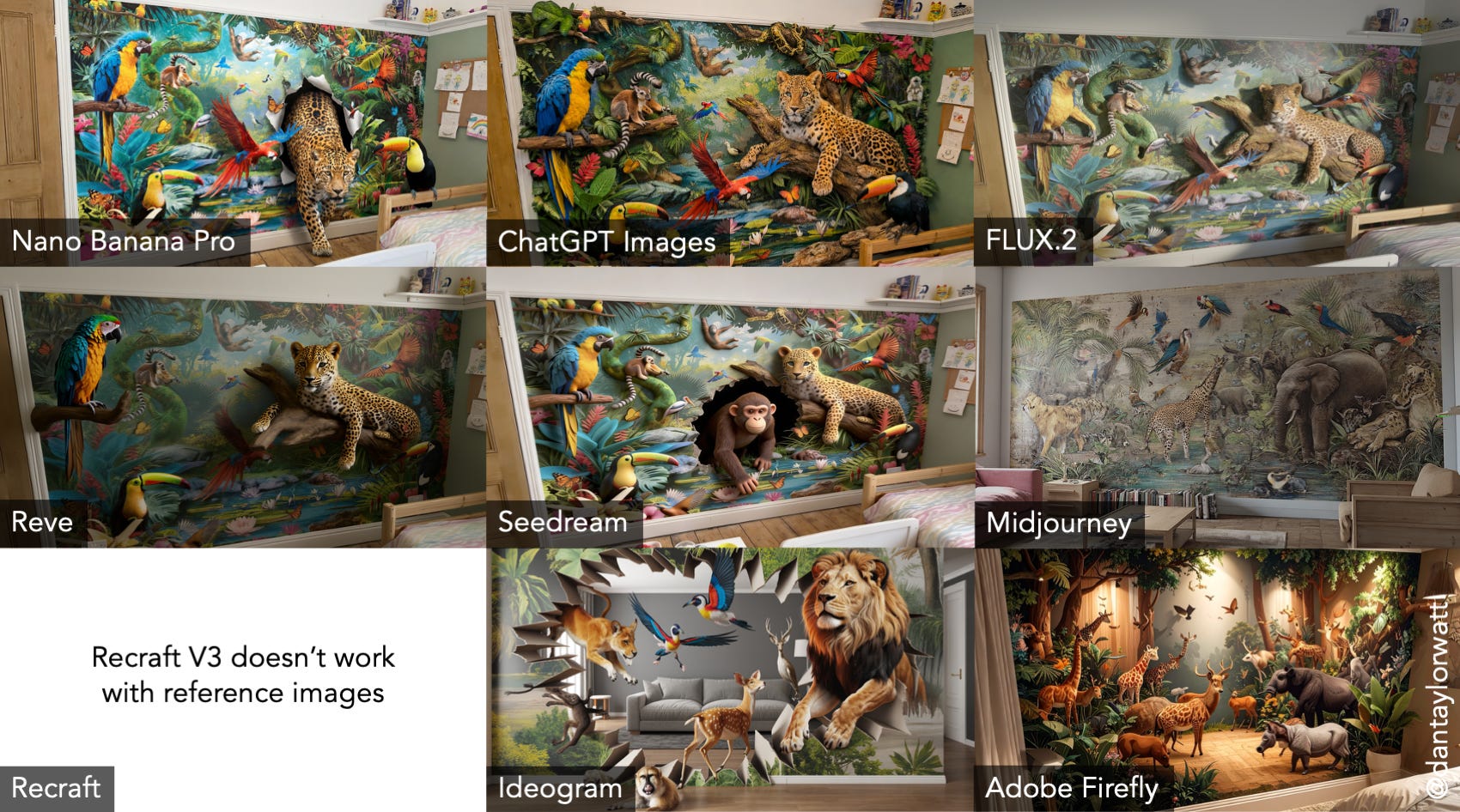 Midjourney, Ideogram and Firefly all diverged wildly from the uploaded image. Seedream cartoonified the animals, whilst FLUX.2 and Reve picked a few animals to apply a 3D effect to.