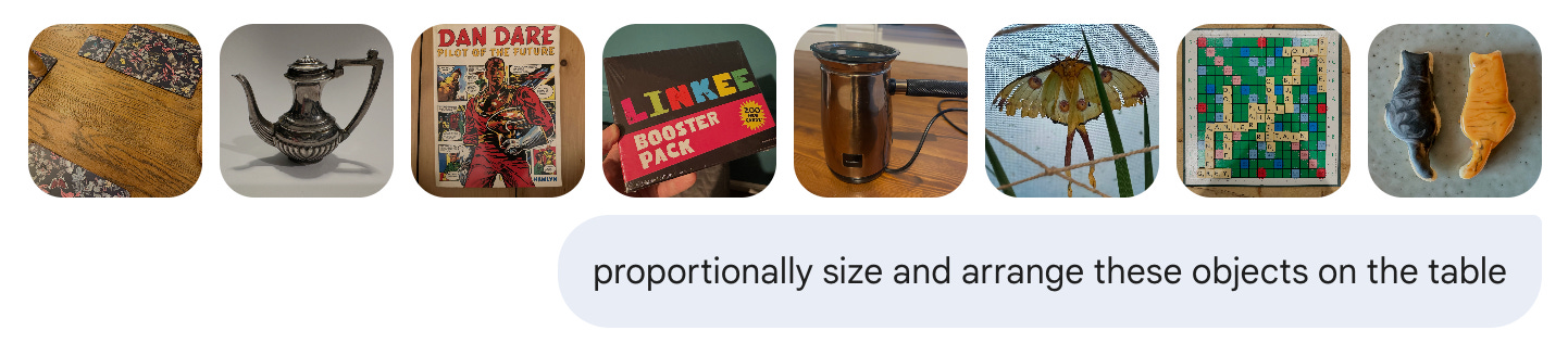 I uploaded eight photos from my phone’s camera roll and asked the models to combine them into a single image, with the objects proportionally sized.