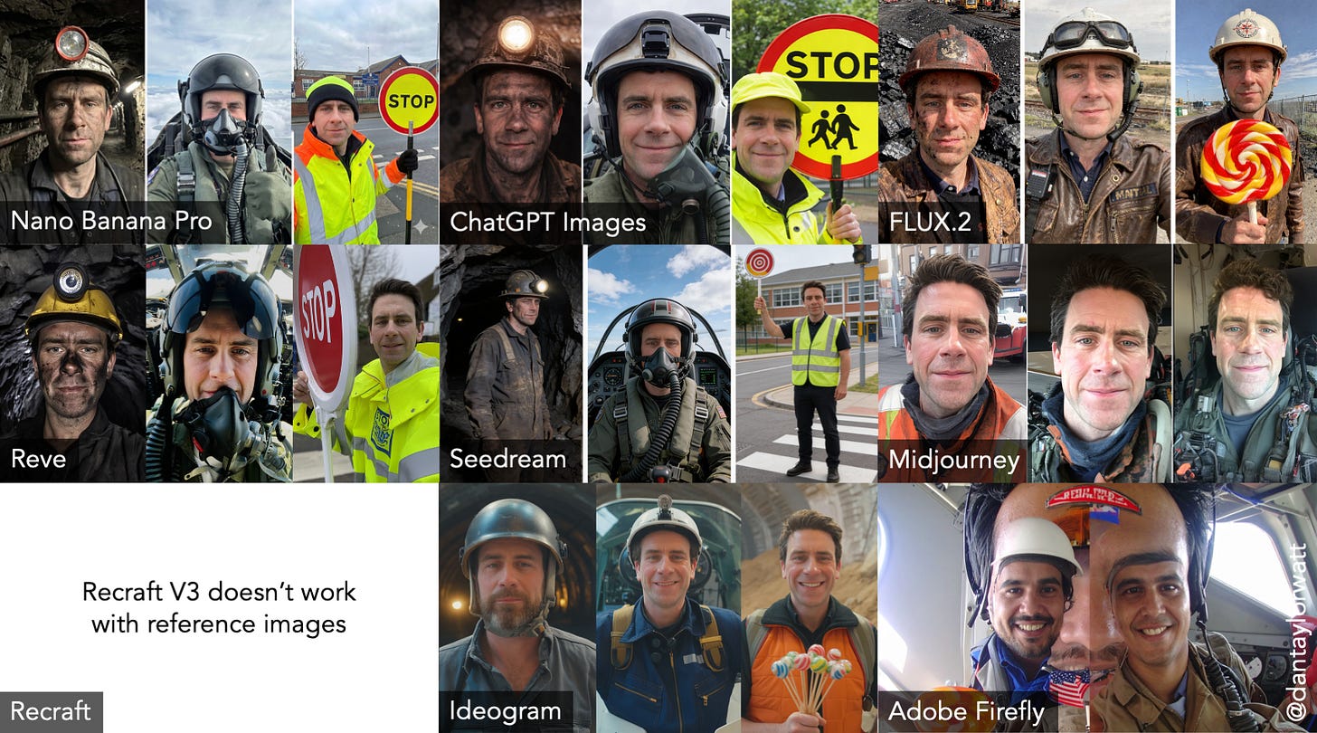 ChatGPT Images rendered the most convincing lollipop man and sign, but slightly lost my likeness with the miner and the fighter pilot.