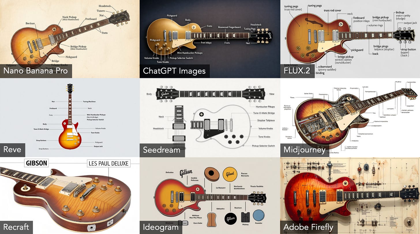 Nano Banana Pro mangled the Bridge Pickup label and didn’t connect the Bridge or Pickup Selector Switch labels with the correct parts, but otherwise did a bang-up job. The drawing of the headstock is particularly impressive, nailing the Gibson branding and Les Paul’s signature.
