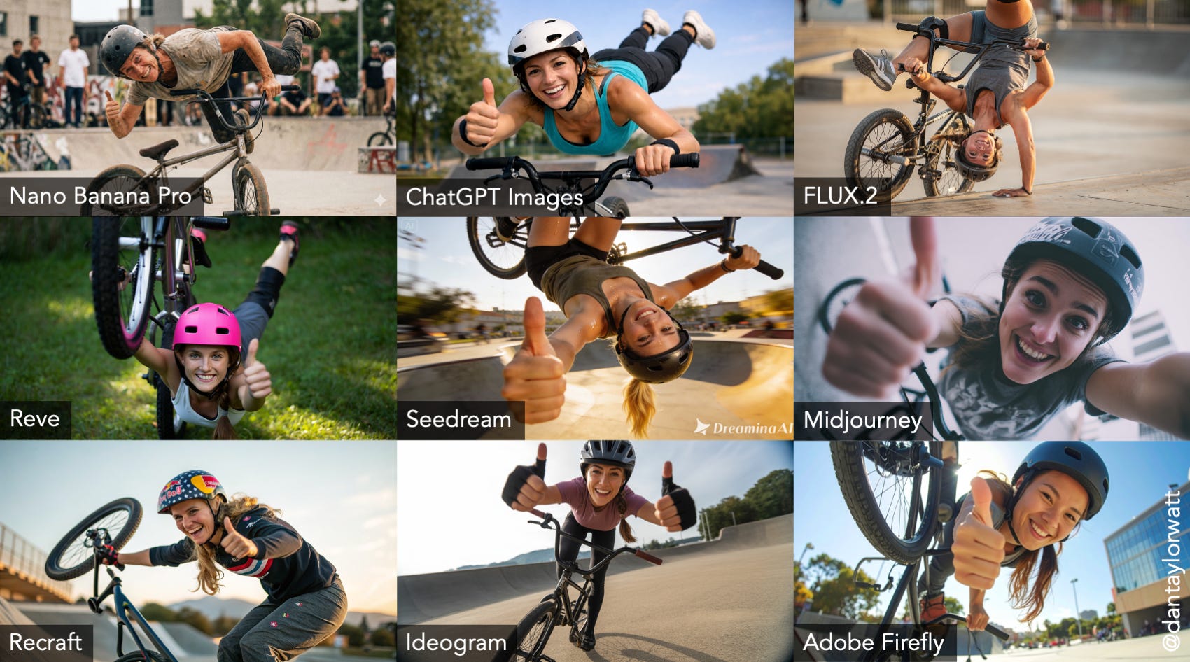 Whilst none of the models totally nailed this tough brief, Nano Banana Pro got the closest, with the rider plausibly balancing on her handlebars with one hand, whilst giving a thumbs up with the other. I initially thought it had messed up by only giving the bike one brake but it turns out Gemini knows more about BMXs than I do.